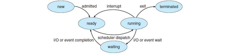 - Waiting: 프로세스가 끝나지 않은 시점에서 I/O로 인해 CPU를 사용하지 않고 다른 작업을 한다. (해당 작업이 끝나면 다시 CPU에 의해 실행되기 위해 ready 상태로 돌아가야 한다.)