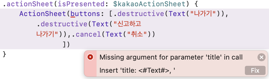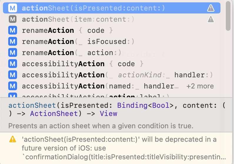 위 처럼 ActionSheet 대신에 confirmationDialog를 사용하라고 친절하게 말해준다.