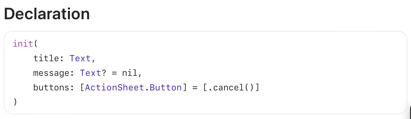 ActionSheet(title: Text, message: Text?, buttons: [ActionSheet.Button])
